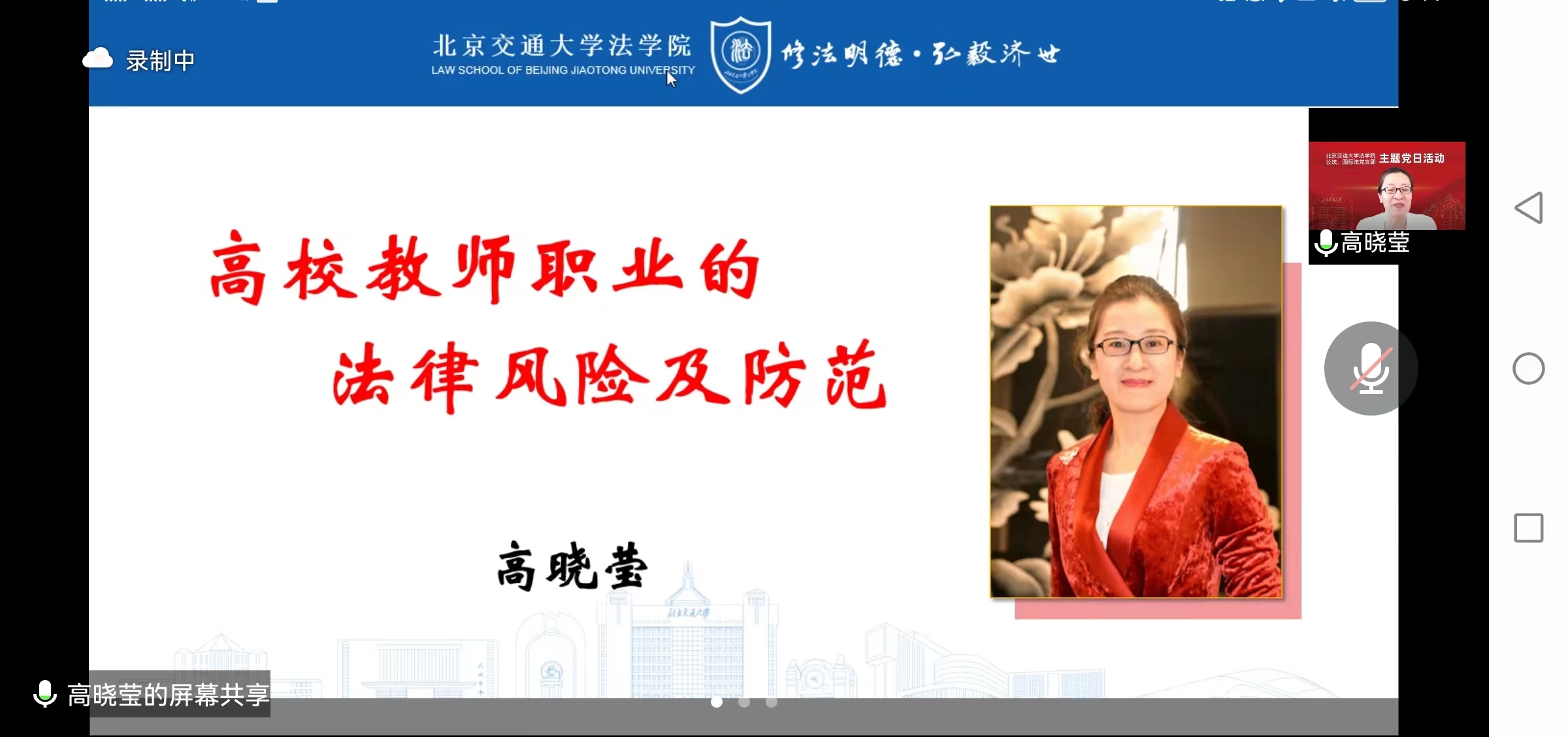 高晓莹教授以“高校教师职业的法律风险及防范”为主题,从“日常行为风险”“教学风险”“科研风险”“与学生交往中的风险”等四个方面为大家详尽的梳理了高校教师可能面临的道德和法律风险,并结合真实的案例,剖析了师德师风建设的内涵和重要性,同时对各种风险及其防范措施进行了细致的讲解。高晓莹教授的讲座,内容丰富、论述全面、情理交融,具有示范启发作用,引起了大家的强烈共鸣。讲座结束之后,公法国际法党支部的老师们针对在教学科研中出现的各种问题进行了进一步的交流、探讨。