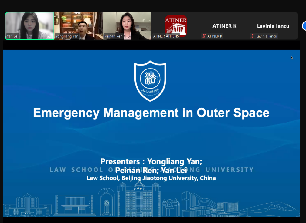 雅典时间7月16日下午4点(北京时间晚上9点),颜永亮老师、任佩楠同学和雷俨同学三人在会议上做了论文题目为《在外太空的应急管理》(Emergency Management in Outer Space)的主题报告,重点讨论如何建立一套系统的应急管理制度来处理包括空间物体之间的潜在碰撞、极端空间天气事件、近地物体撞击、有害频率干扰和激光束的有害使用等威胁,并做学术交流,为后续相关论文的撰写、投稿国际核心期刊做准备。